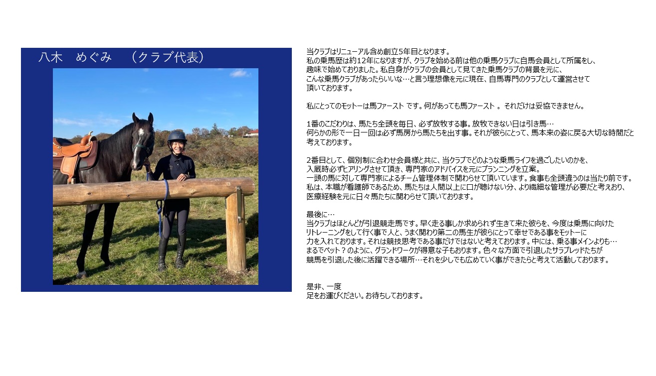 - 引退競走馬を含む、あらゆる馬と人とのコミュニケーションを大切にするという考えから、
